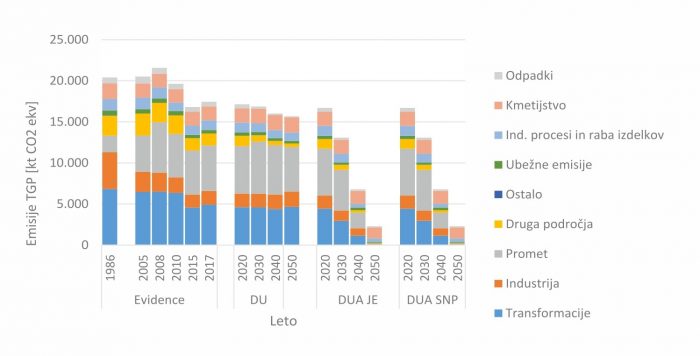 Slika: Sektorska struktura emisij TGP v izbranih preteklih letih ter po projekciji za scenarije OU,DUA JEinDUA SNP za leta 2020, 2030,2040in 2050 (vir: ARSO, IJS-CEU, KIS)